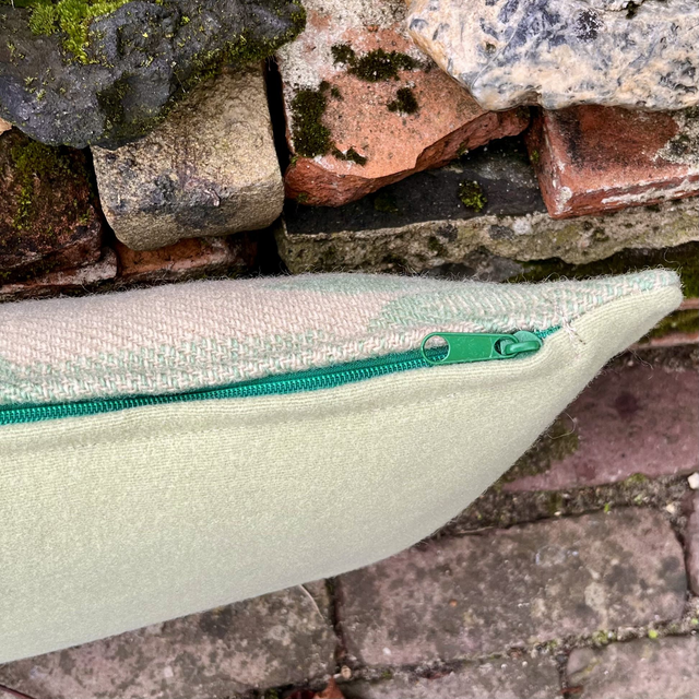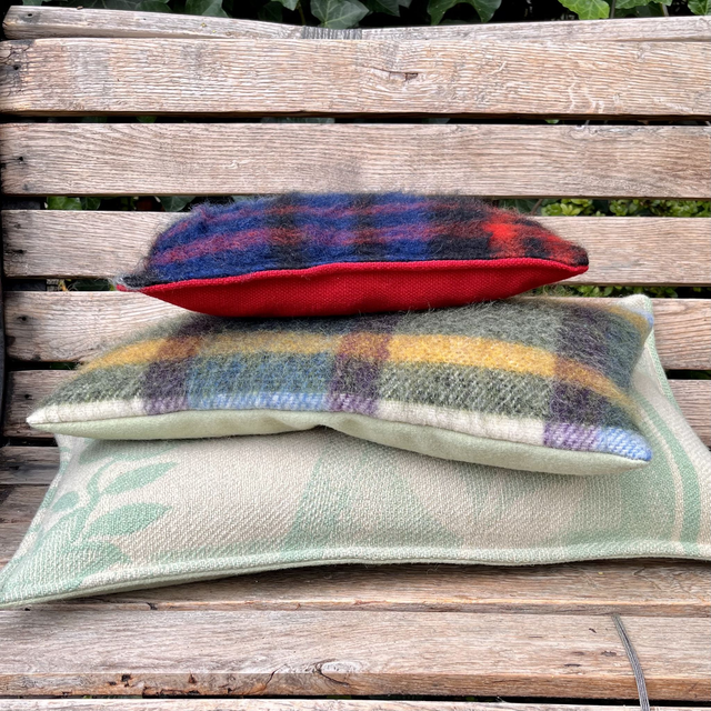 Deze wollen deken is echt oud, al geloof ik dat je tegenwoordig vintage moet zeggen, hij komt nog van mijn opa en oma. Oud of vintage; de deken heeft een mooi bloem-bladmotief. Ik heb er lang naar staan kijken om te bepalen hoe ik zou gaan knippen om er zoveel mogelijk mooie stukken uit te kunnen halen. In deze asymmetrische hoes is een bloem terecht gekomen.