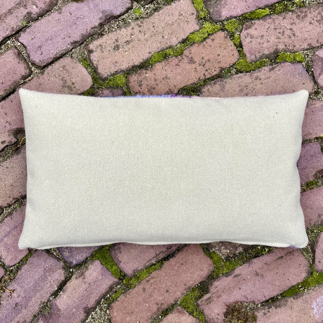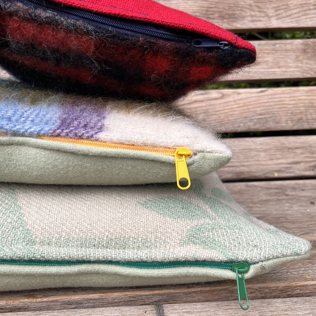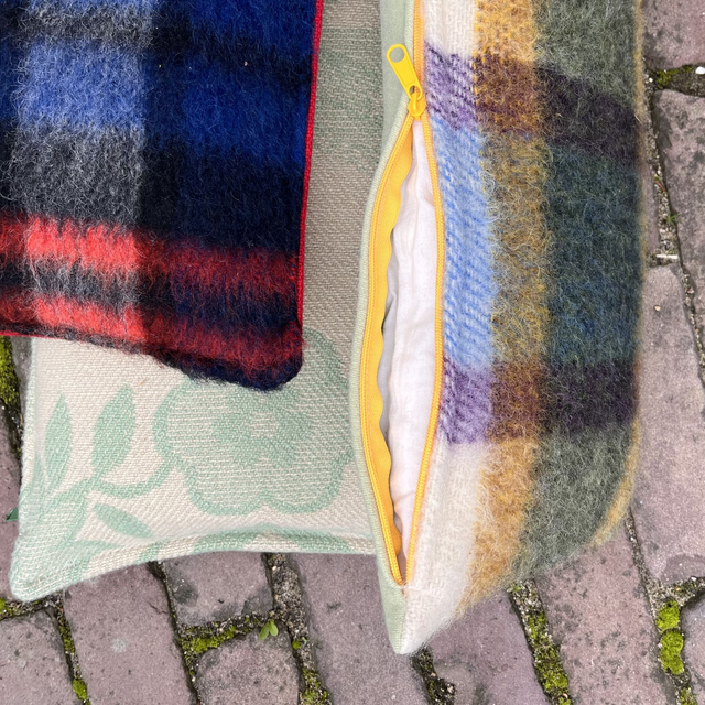 Een lekker zacht kussen, gemaakt van wollen dekens met wollen binnenkussen.