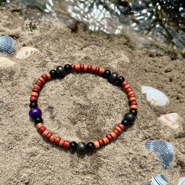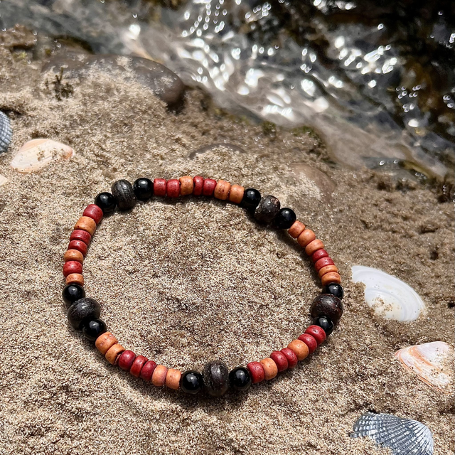 Klein enkelbandje in warme houtkleuren met zwarte edelstenen.