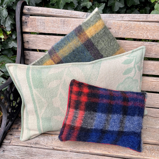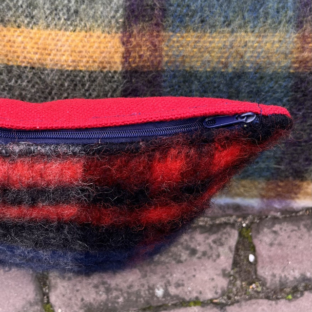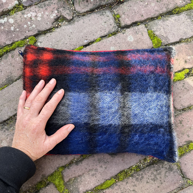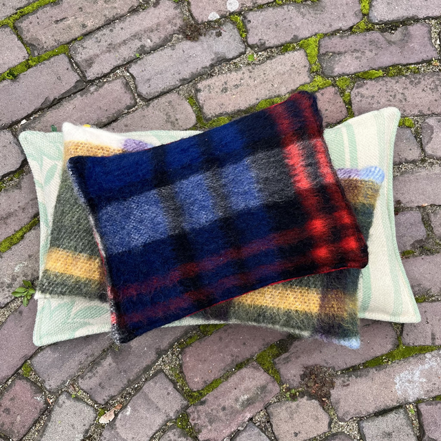De voorkant is gemaakt van een wollen AaBe deken en de achterkant van een stevig geweven wol voor meubelstoffering. Je kan hem dus gerust op de grond leggen.