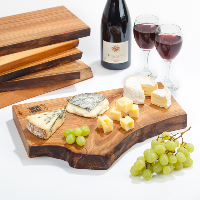 De plank is gemaakt van één stuk Nederlands hout, dus zonder lijm of andere chemische producten. Door de tekening en de grillige bastkant is iedere plank uniek.